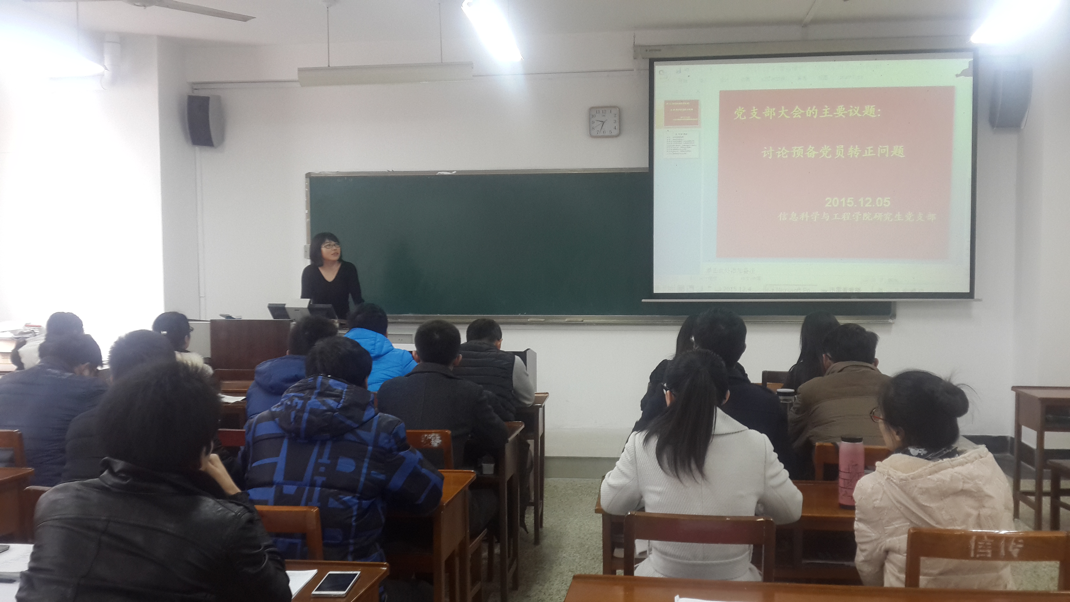 2015年12月5日上午9:30,信息科学与工程学院研究生党支部转正大会在C楼312顺利召开。信息科学与工程学院研究生党支部书记夏小娜老师以及全体研究生党员、预备党员参加了本次会议。本次会议由研究生党支部副书记郭旗同志主持。