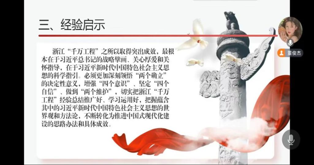 第一二三党支部线上开展“造就万千美丽乡村,造福万千农民群众--学习浙江‘千万工程’经验案例”的专题学习。本次会议由分党校秘书长董俊杰主持,三个支部全体党员参加。