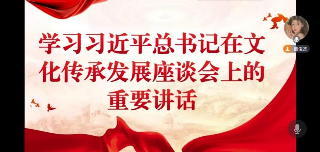会议伊始,党秘董俊杰指出本次线上专题学生会的主题为“学习习近平总书记在文化传承发展座谈会上的重要讲话”。在讲话中,习近平总书记强调,在新的起点上继续推动文化繁荣、建设文化强国、建设中华民族现代文明,是我们在新时代新的文化使命。广大党员要始终坚定文化自信、担当使命、奋发有为,共同努力创造属于我们这个时代的新文化,建设中华民族现代文明。