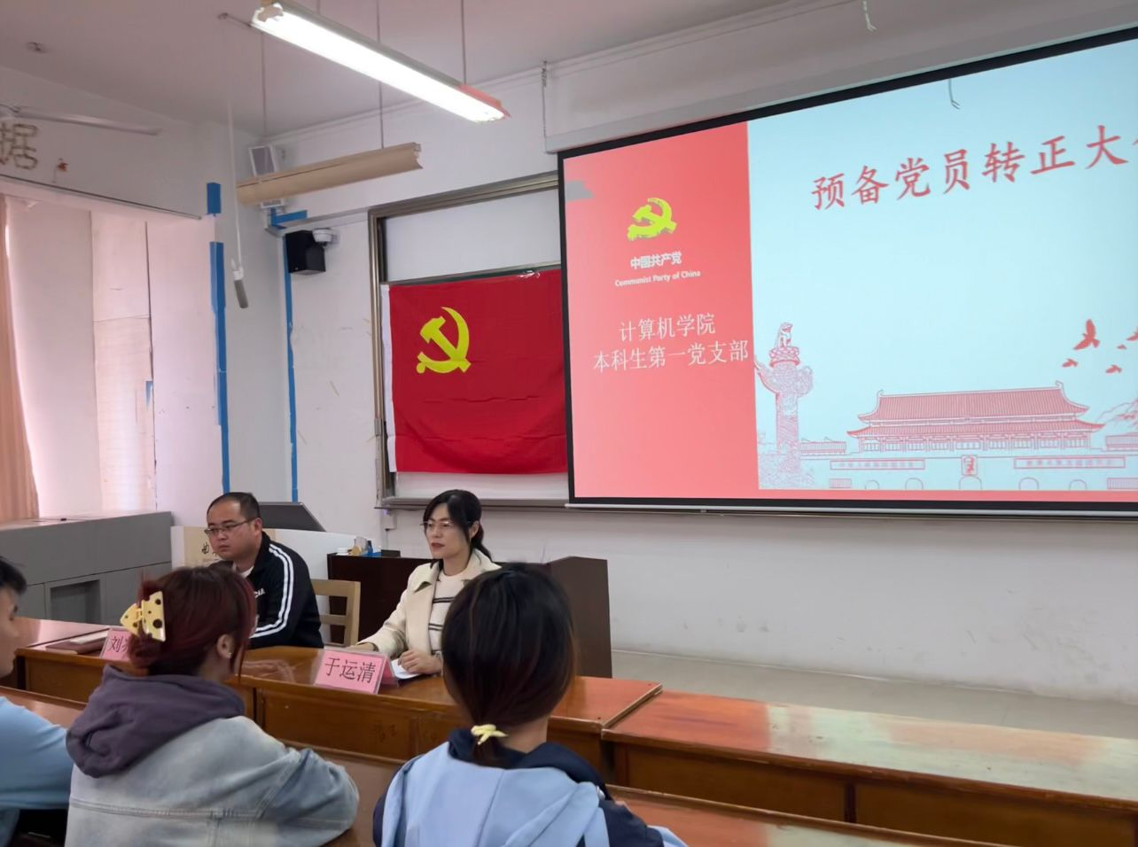 2024年4月10日下午两点五十,兔子先生 本科生第一党支部于JC406召开预备党员转正大会,大会就刘龙奇同志预备党员转正问题进行讨论和表决。兔子先生 本科生第一党支部书记于运清、支部副书记刘兆宇及学生党员参加此次会议。