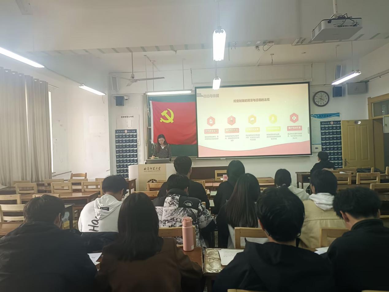 首先,支部书记杨丹丹带领大家学习了《中国共产党不合格党员组织处置办法》的各项内容,并强调学生党员应坚持以习近平新时代中国特色社会主义思想为指导,深入贯彻习近平总书记关于党的建设的重要思想,认真落实新时代党的建设总要求和新时代党的组织路线,在政治、思想等方面严格要求自己,提高党员队伍建设质量。