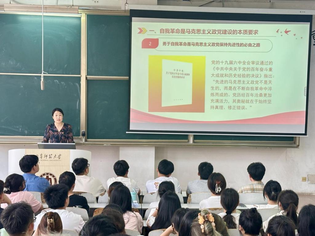 党委书记张明洁在JE103教室为学生干部讲授廉政党课。本次党课以“党的自我革命与中央八项规定”为主题,旨在深入学习贯彻中央八项规定精神,进一步加强学生干部的纪律作风建设,切实增强其责任意识和担当精神。