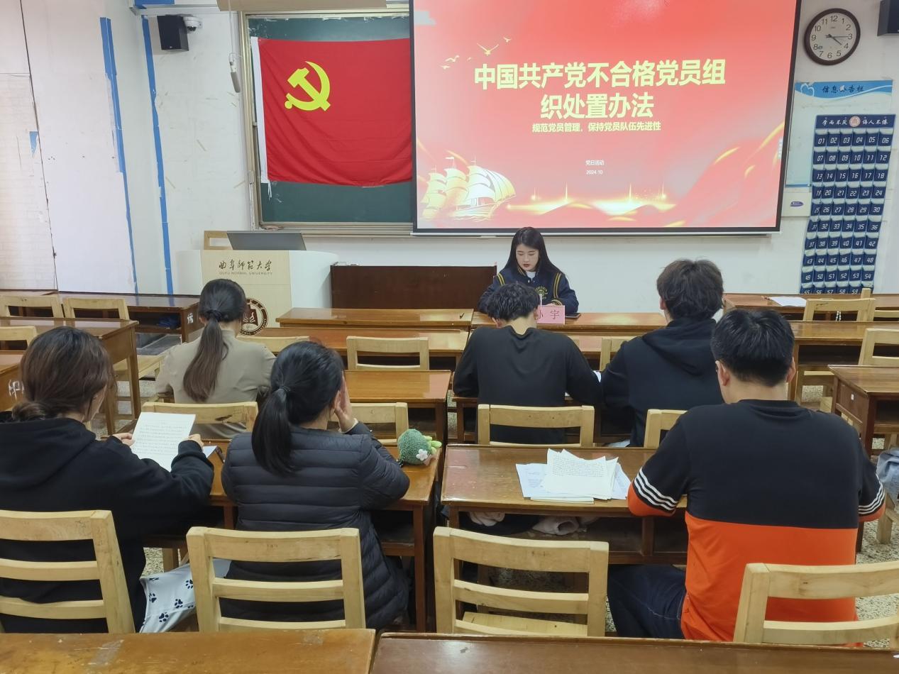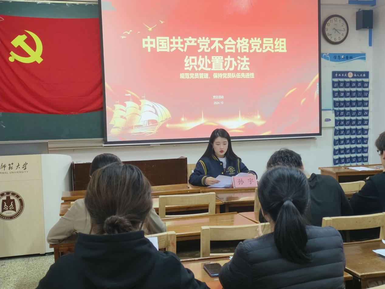 首先,支部书记孙宇带领大家学习了《中国共产党不合格党员组织处置办法》的各项内容,并强调学生党员应坚持以习近平新时代中国特色社会主义思想为指导,深入贯彻习近平总书记关于党的建设的重要思想,认真落实新时代党的建设总要求和新时代党的组织路线,在政治、思想等方面严格要求自己,提高党员队伍建设质量。