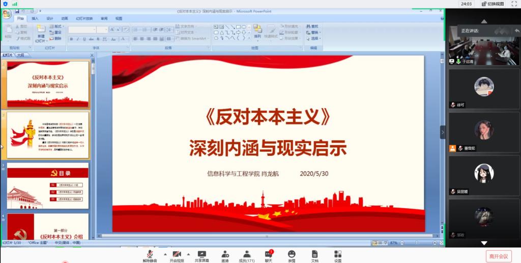 为加强对入党积极分子的教育,提升入党积极分子的思想道德觉悟,5月31日上午八点,信息科学与工程学院组织开展线上主题党课活动,本次党课以《反对本本主义》深刻内涵与现实启示为主题,信息科学与工程学院党委副书记肖龙航出席并担任主讲,本科生党支部书记于运清及入党积极分子参加了本次党课。